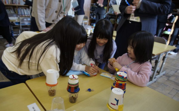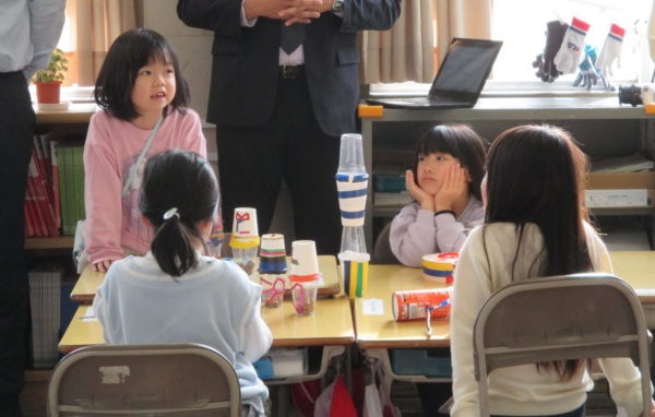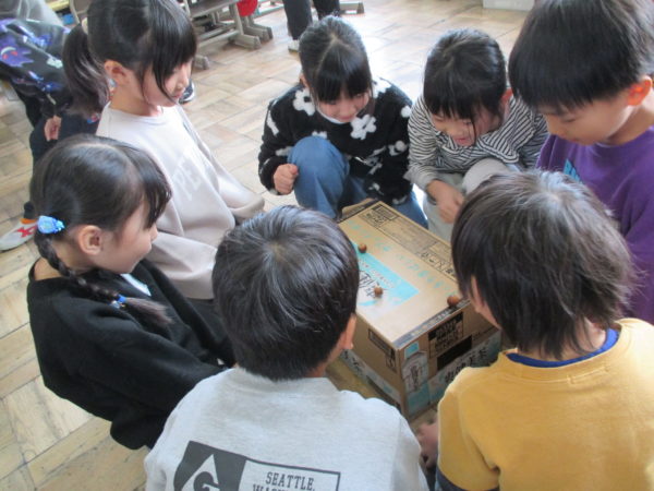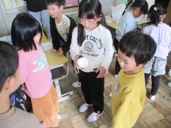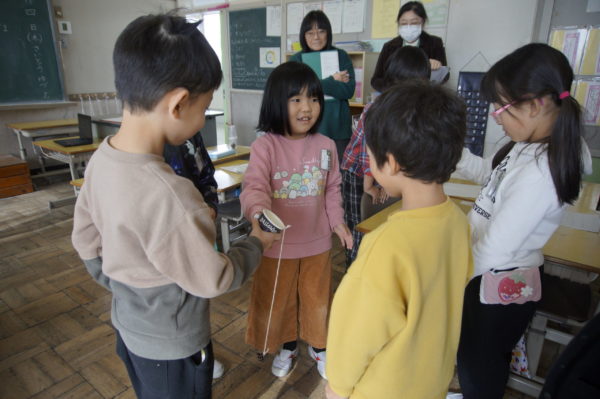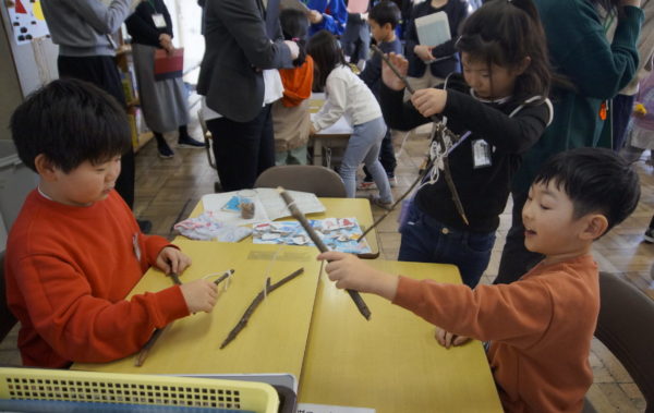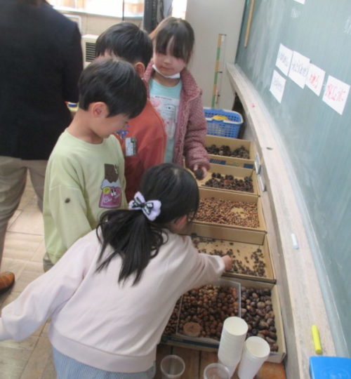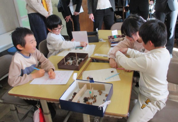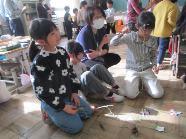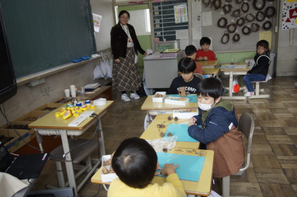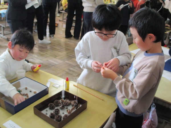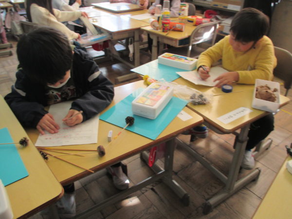 1年生生活科「あきをさがそう」の学習では、これまで学校の周りや総合運動公園、飯豊少年自然の家など様々な場所で「あきさがし」に取り組んできました。今度は、友だちと協力しながら「あきのおもちゃづくり」に挑戦しています。来週、幼稚園の年長さんたちとの交流を予定しているので、年長さんたちが喜んでくれるようにとみんな張り切って準備を進めています。